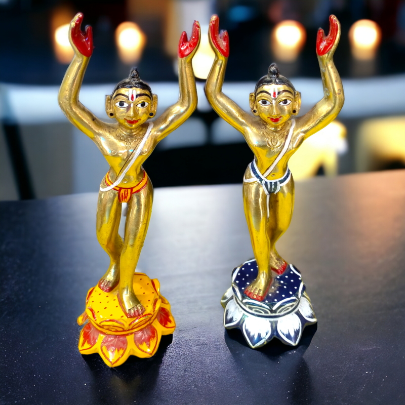 These deities are made from brass and are hand painted. They are 20cm tall and solid on the inside. There is carved jewellery on the deities. Very sweet deities to worship.