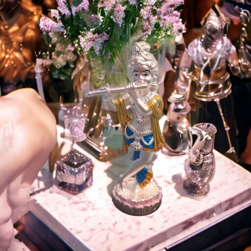 Krishna playing flute is a beautiffuly carved deity from 99.99 purity silver. Great for your altar, home, car dashboard etc.
