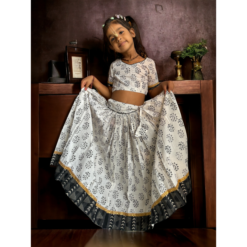 White colour with patterned design and black border. The skirt comes with a blouse.