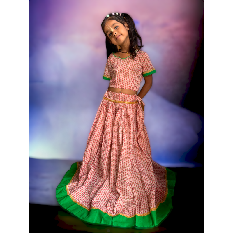 Red colour with flower pattern design and green border. The skirt comes with a blouse.